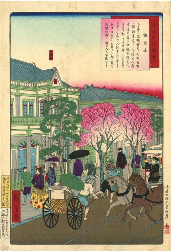 1869年,连续5年遭受火灾的银座,以此为契机成为了不燃的砖街。本通的宽度扩大到15间,约27米后,被委托给英国人沃特鲁斯的设计。