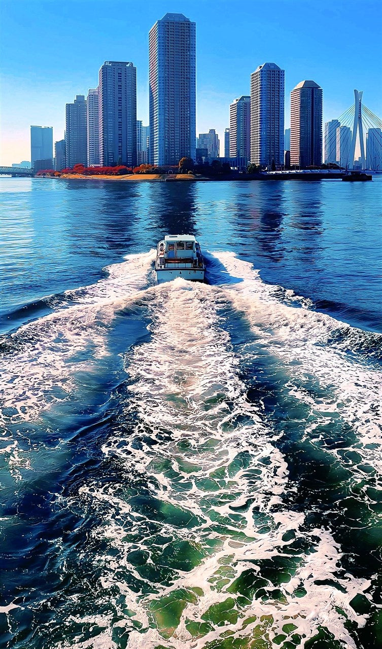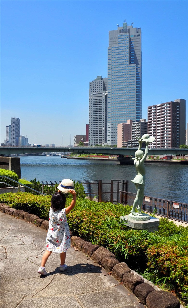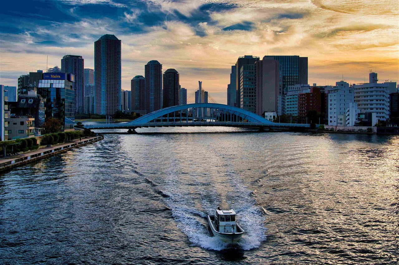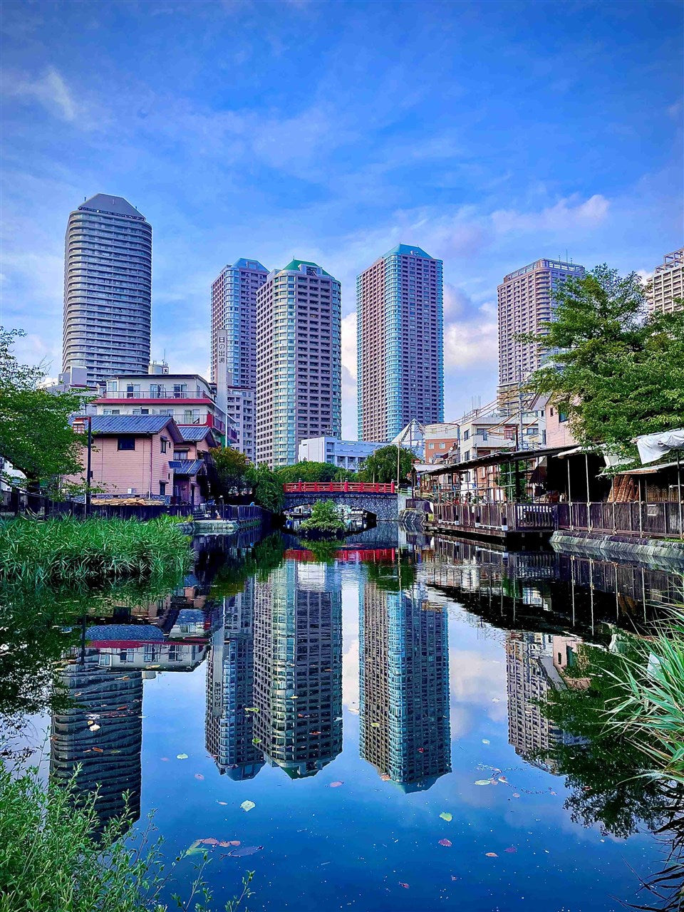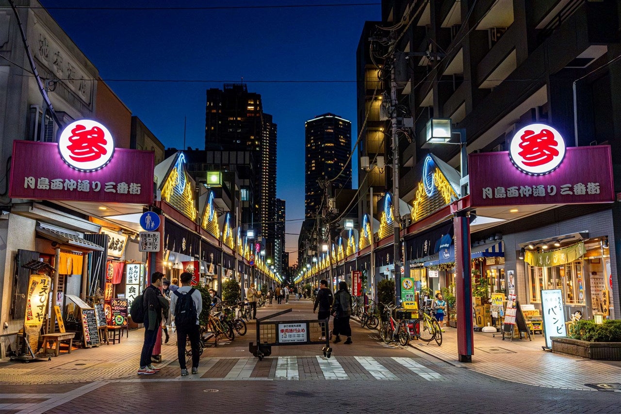 在月岛散步,在名产文字烧店林立的月岛西仲通商店街回头一看,繁华的街道和前面胜景的高层建筑上开始点亮灯光,黄昏的风景正在蔓延。拍摄了那个风景在月岛散步的回忆中。