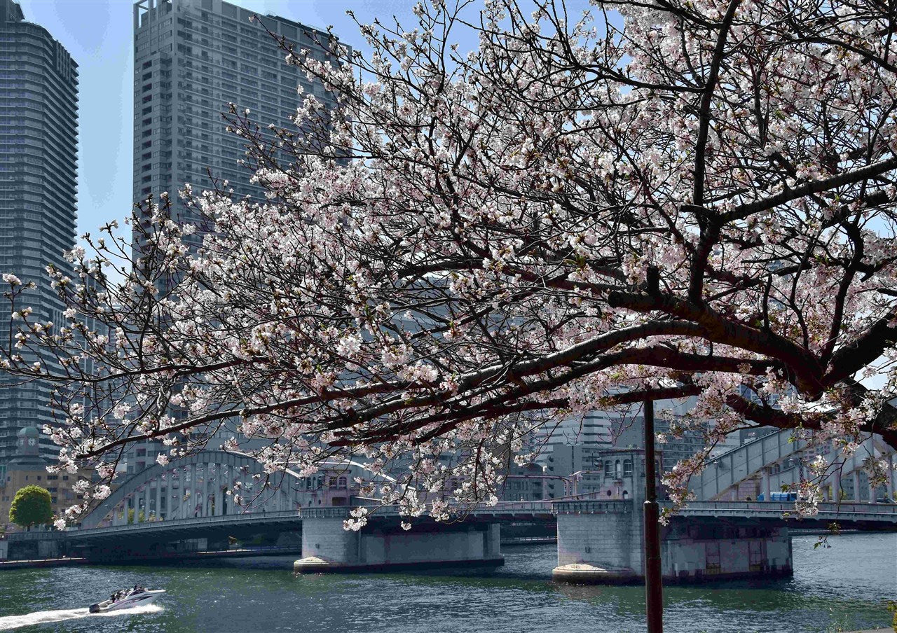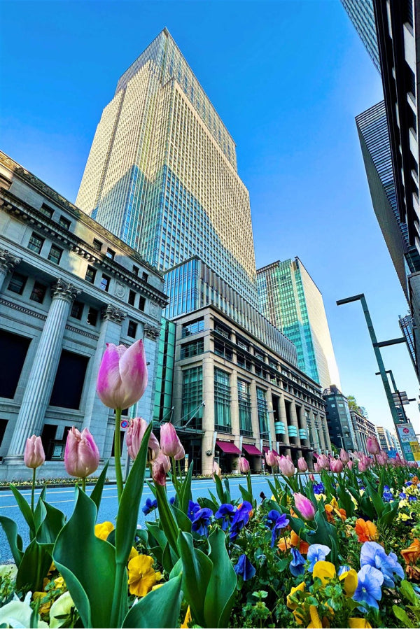 日本桥室町的春天。在中央路的人行道上,色彩鲜艳的郁金香和三色堇漂亮地开放并排行进着。在晴朗的天空下,三井塔也享受着美丽的游行。为了瞄准天气、花的开放方式、车和人不在的时机而辛苦。